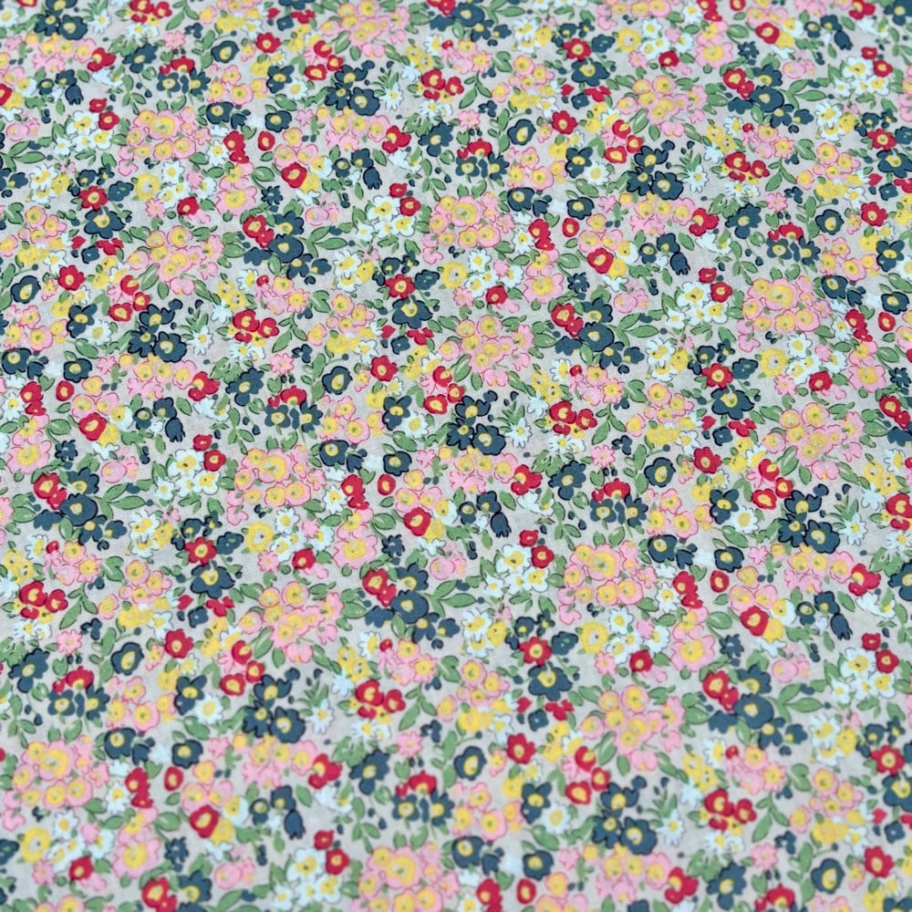 Made to Order - Delicate, busy floral pattern with small, colourful flowers set against a light taupe background.